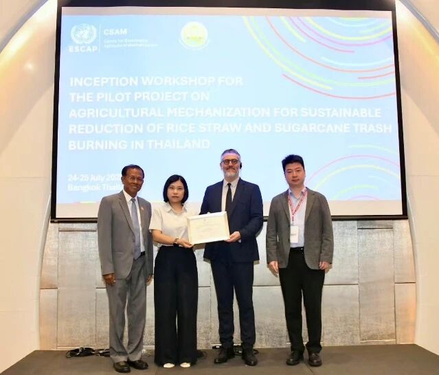 The Centre for Sustainable Agricultural Mechanization (CSAM) of the United Nations Economic and Social Commission for Asia and the Pacific (ESCAP), in collaboration with the China Agricultural Machinery Distribution Association (CAMDA), organized a Machinery Donation Ceremony as part the Inception Workshop for the Pilot Project on Agricultural Mechanization for Sustainable Reduction of Rice Straw and Sugarcane Trash Burning in Thailand alongside the CIAME Asia 2025 – Thailand International Agricultural Machinery Exhibition on 24 July in Bangkok, Thailand.